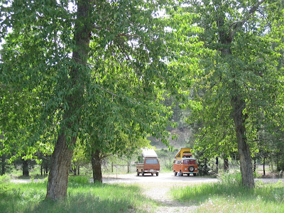 There are a couple dozen level sites and I'm thinking most or all will handle a couple VWs. The best ones are along the Clark Fork River and my very favorite is #22, which I believe is the most isolated; our neighbors were distant and entirely unnoticeable. Bring a canoe or a tube (and fishing gear), but you probably should stay out of the river during Spring runoff (April/May), when it'll be pretty full and fast. Little ones and dogs especially. The pond would be a great alternative when the Clark Fork is high.