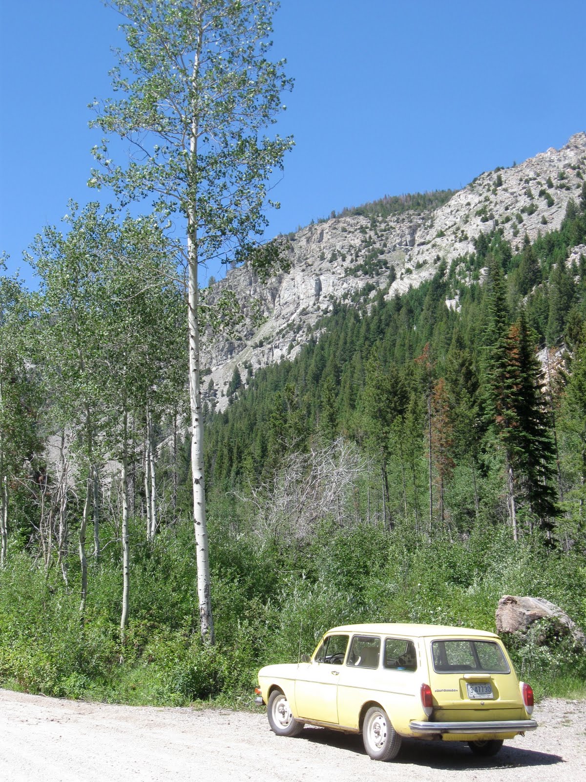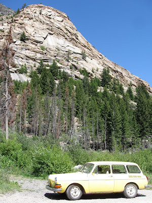 The entrance was clogged by some older dude and his wife trying to turn their rig around--a big truck with a big fifth wheel camping trailer goosenecked to it. He wasn't doing a good job. Gertie is small and nimble so she slipped by, only to be halted by the guy's whistle. Paranoid that I am, I expected him to inform us that our car was hemorrhaging some fluid or other but he just asked us "if there's a place up there to turn around." I told him there was.