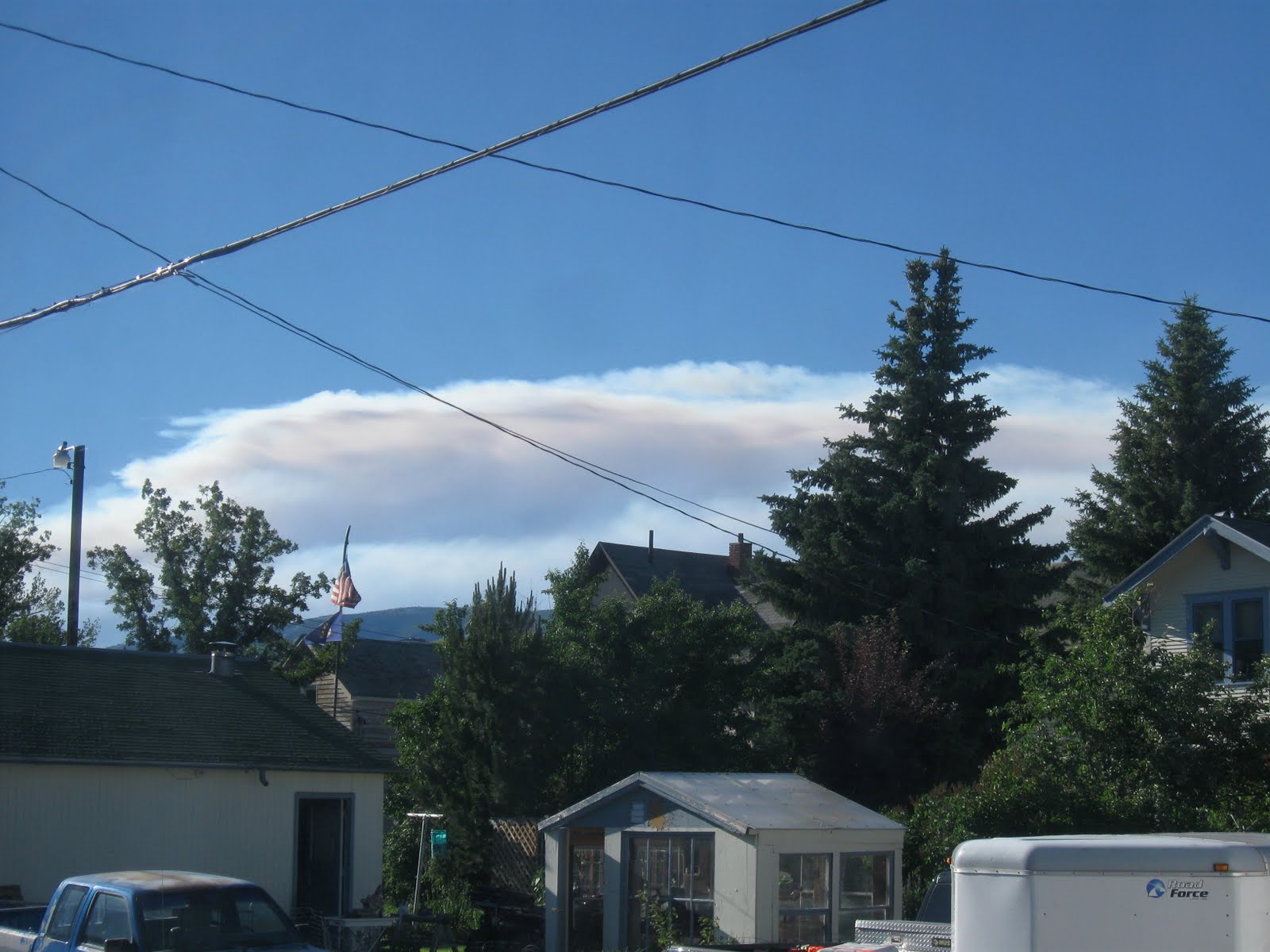 When we got back into town our across-the-street neighbor asked if there was a fire someplace. "Why would he ask that?" you ask. Because he saw this pyrocumulus building off to the Northwest. It turned out it was some trees being converted to charcoal and gas back in the Sapphires someplace, maybe sixty or so miles away as the crow flies.